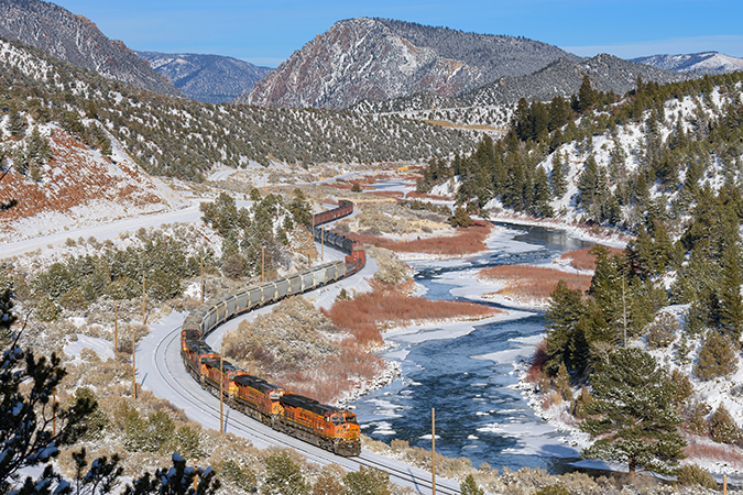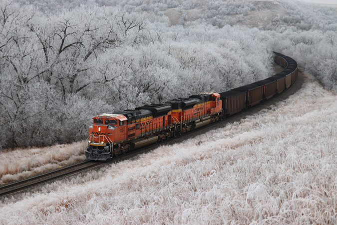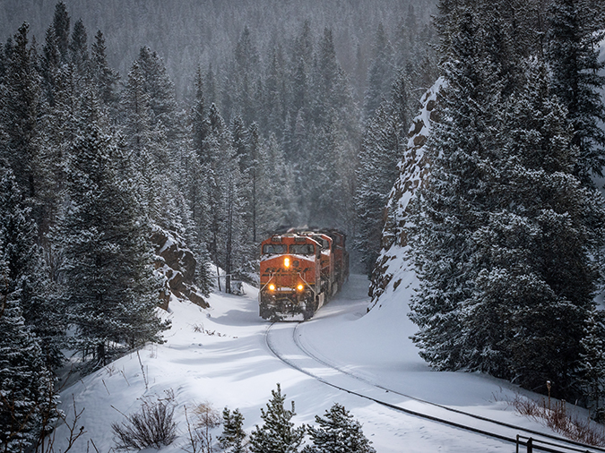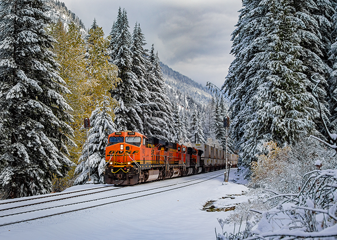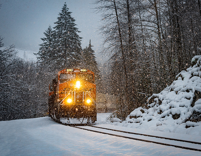 Trains are most often thought of for their practical value. They move goods and are the backbone of our economy. However, those with an artistic eye can also capture something more: their beauty. In the winter, the vivid orange of our BNSF locomotives is stunning against the contrast of white, snowy landscapes.