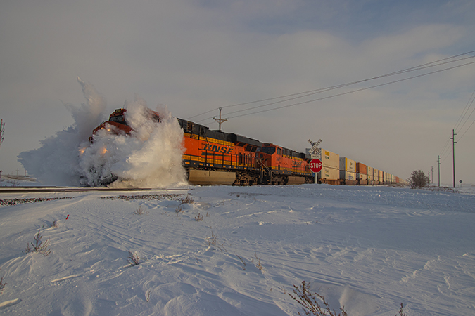 “BNSF’s Q-CHCSSE, a container train from Chicago to Seattle, is seen blasting a snow drift west of Perham, Minnesota, on a late December afternoon.”