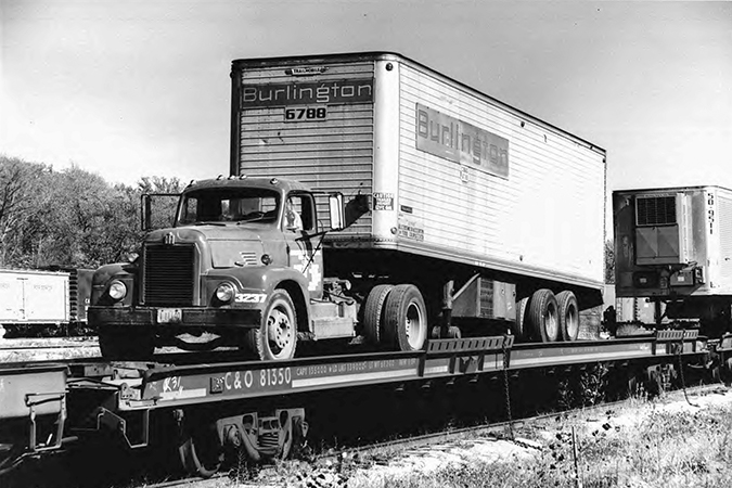 “Piggyback” is the transportation of truck trailers on railroad flat cars. In the 1950s, Santa Fe Railway, a BNSF predecessor, was a pioneer of this transportation method, now evolved and called intermodal.