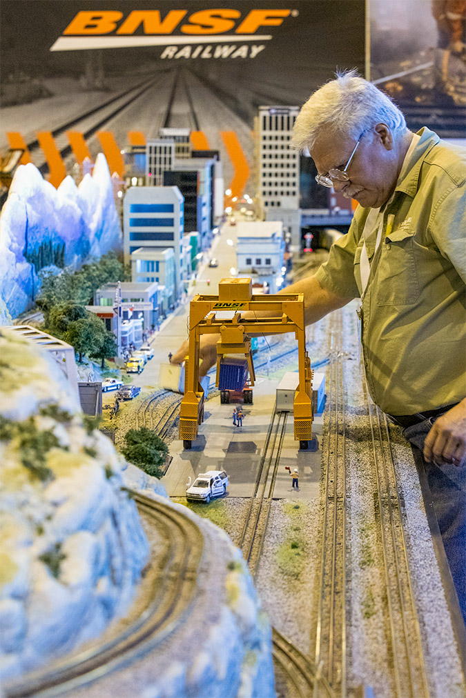 A large graphic wall displaying BNSF corporate messages is installed behind the layout. The layout typically takes about four hours to set up and another two to get trains running. Since that first year, the team has added more vignettes of people doing everyday tasks. The railcars are updated occasionally to coincide with new BNSF equipment.