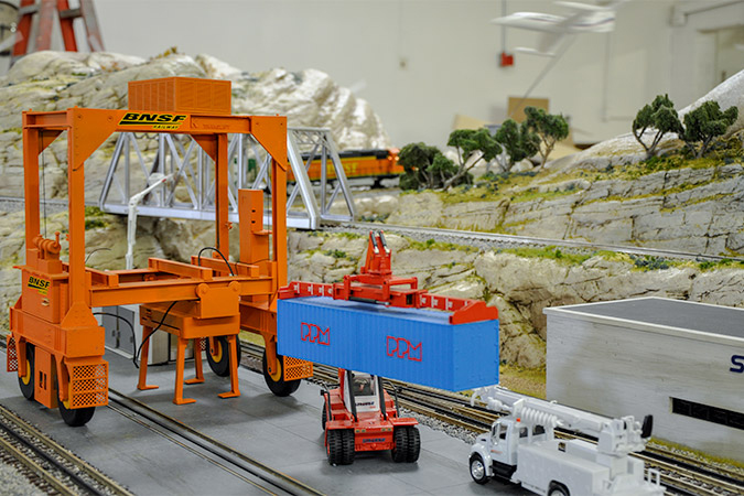In addition to a downtown, plans called for mining operations, a coal-fired power plant, grain elevators and an intermodal yard. Three loop tracks would run over mountains and through the cityscape, tunnels and rural areas, connecting the railroad to customers – just like in real life. It would also showcase the diverse commodities BNSF handles (intermodal, merchandise, grain and coal) and run multiple trains at the same time. And with a nod to passenger operations, a union station and a streetcar were incorporated.