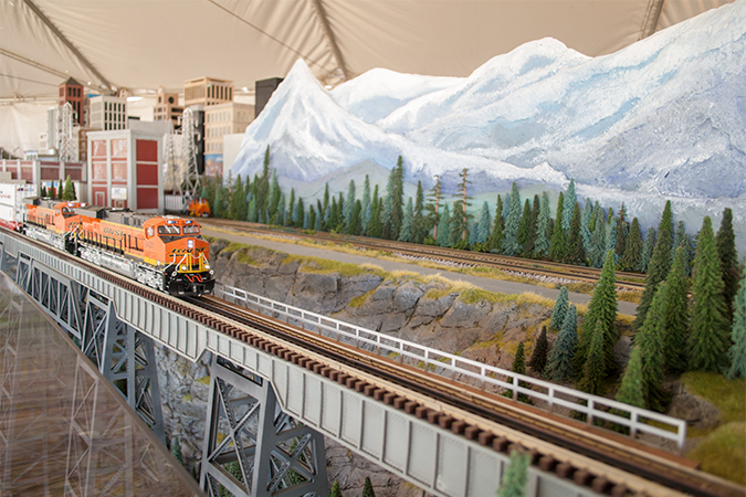To make the layout transportable, the TW TrainWorx team employed modular construction using eight 4- by 8-foot sections that allow the display to be broken down, moved on casters then hauled in a 53-foot trailer.